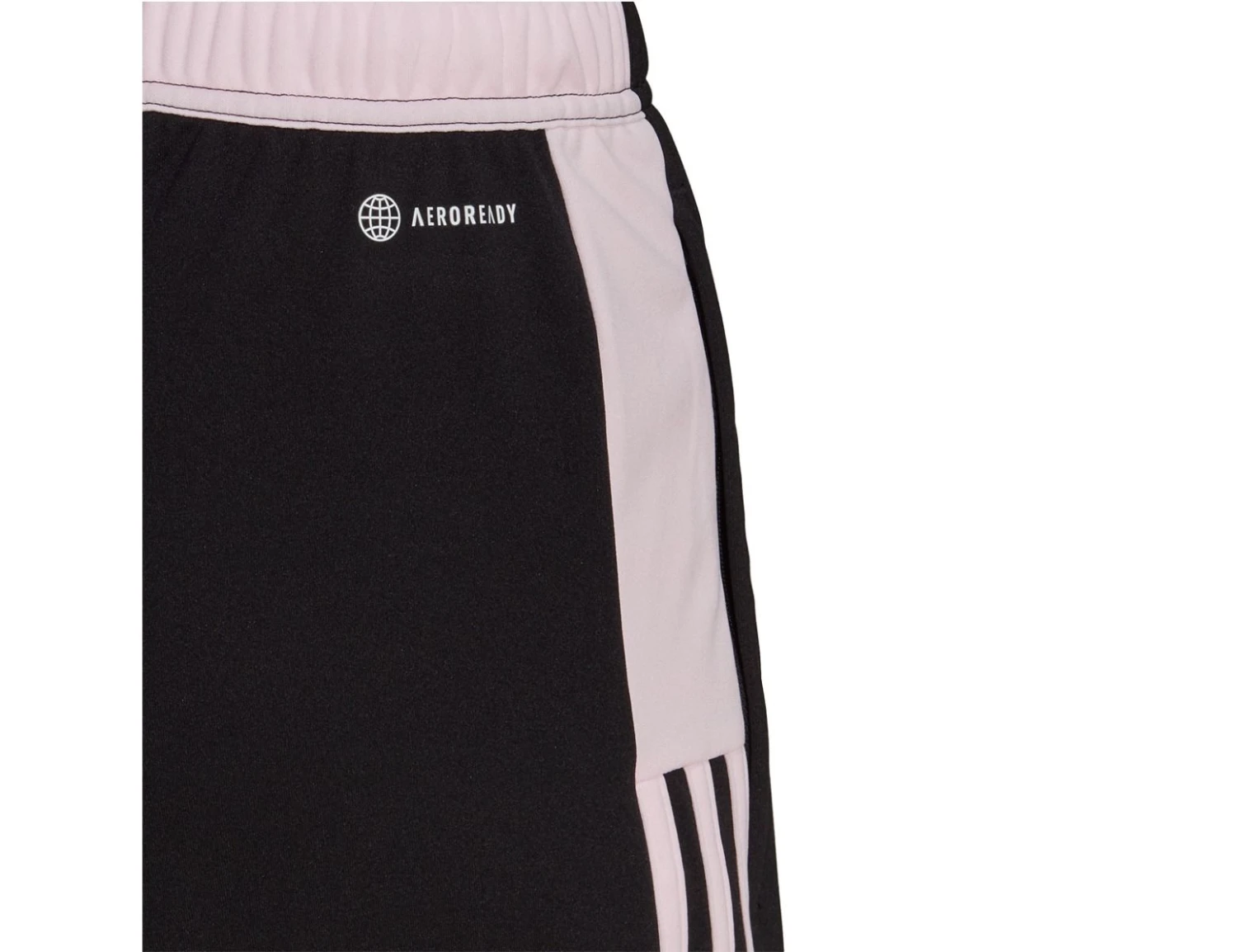 The adidas Tiro Training Shorts for women are made of a smooth fabric and moisture-regulating AEROREADY technology. The two side pockets have a zipper. The shorts have a regular fit and have an elastic waistband with drawstring. Light pink 3-Stripes are visible on the sides.