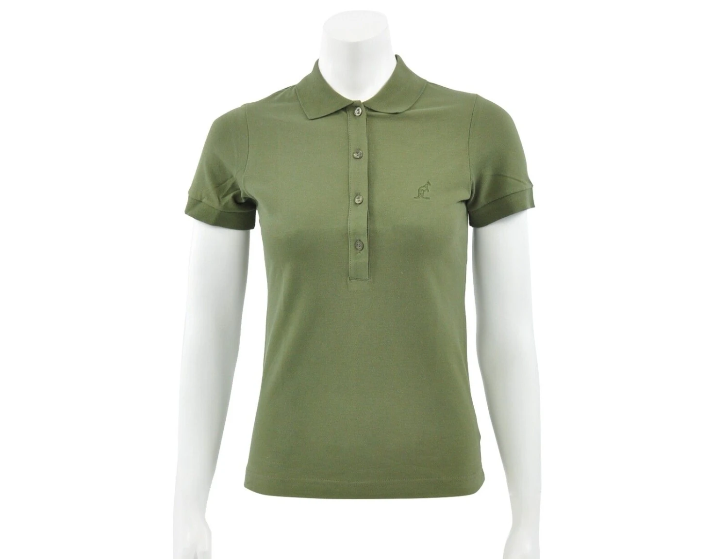 Armee grünes Polo für Damen. Dieses Polo hat einen gerippten Kragen mit Knopfverschluss, das Australian Logo ist vorne aufgestickt. Das Polo besteht aus einem weichen, dehnbaren Stoff und hat eine normale Passform.