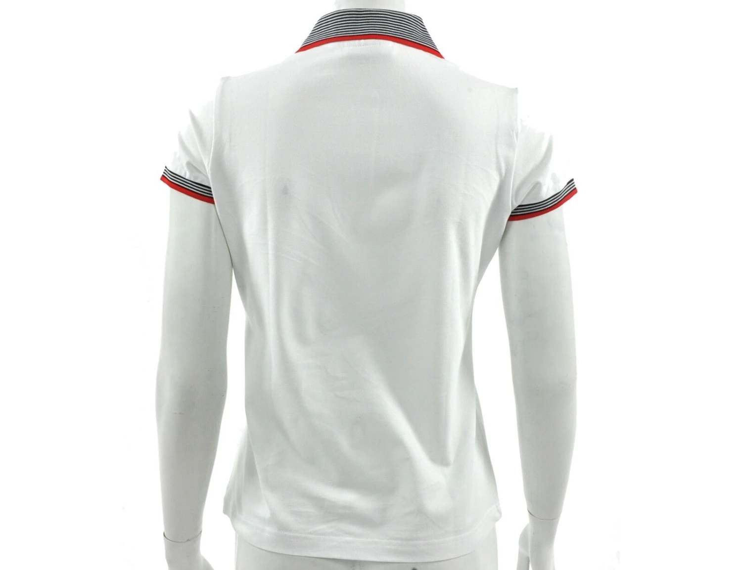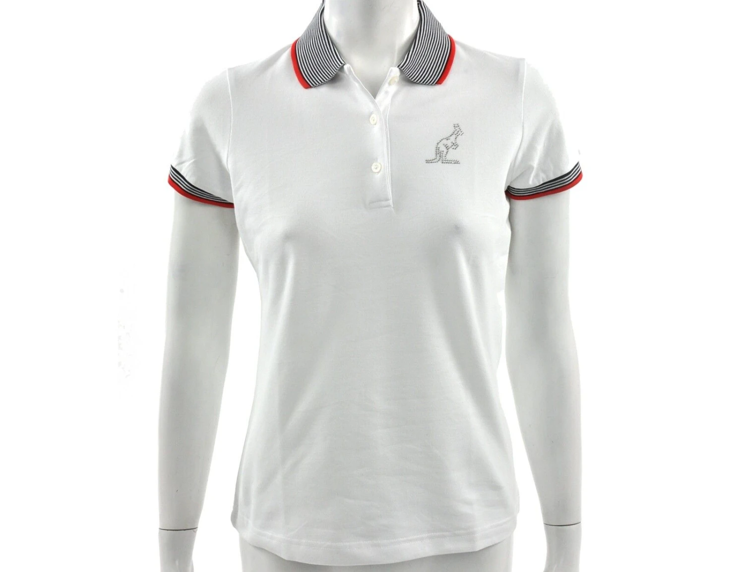Tailliertes, weißes Damen Poloshirt von Australian. Das Poloshirt hat elastische, gerippte Ärmelbündchen, einen gerippten Kragen und eine Knopfleiste mit 3 Knöpfen. Auf der Brust ist ein glitzerndes Australian Logo.