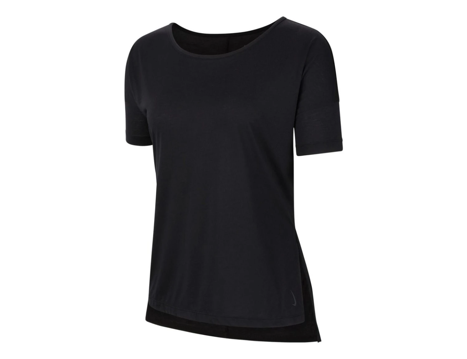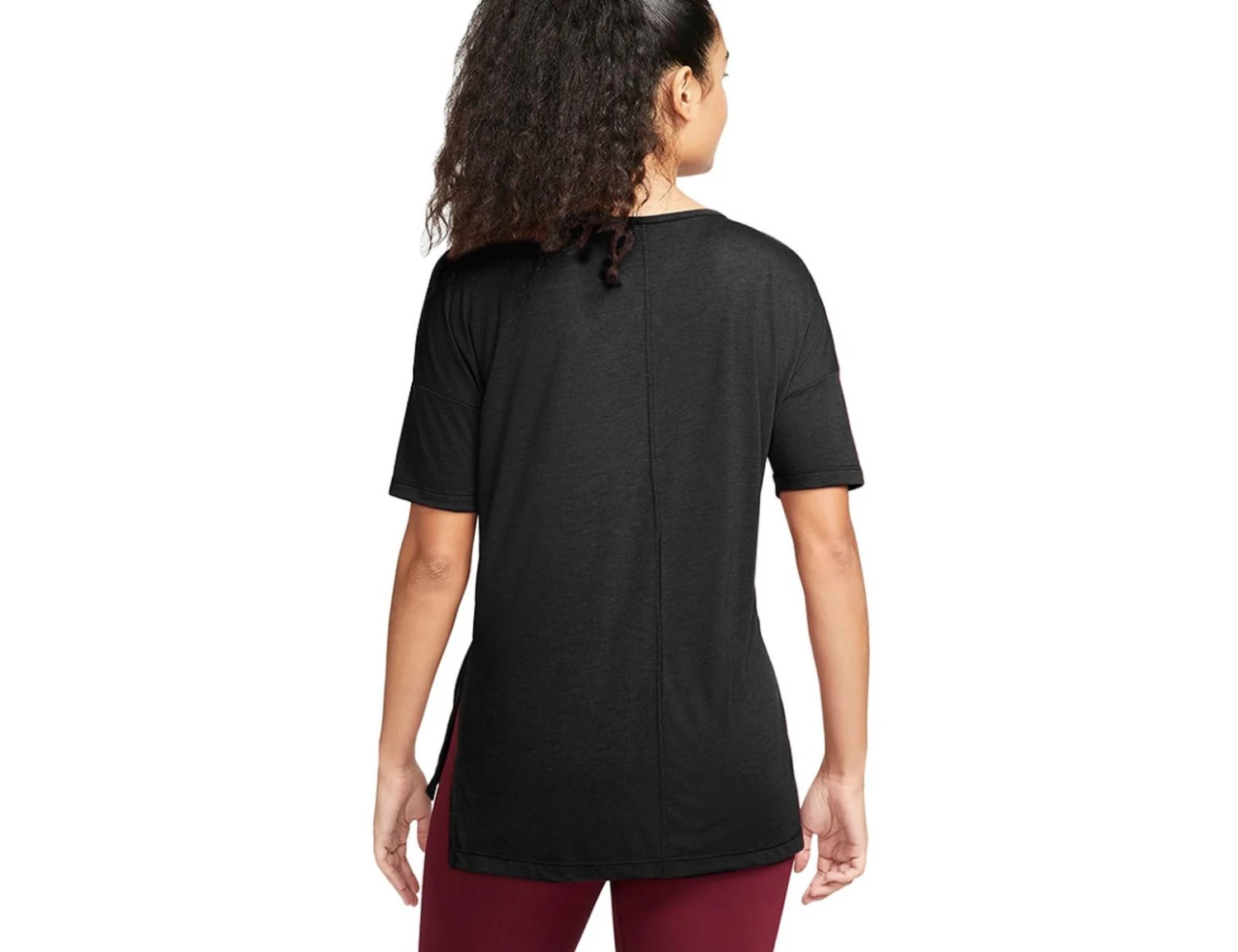 This Nike Women’s Yoga Top features sweat-wicking Dri-FIT technology and is made from breathable fabric for lasting comfort. The open neckline and side slits allow you to move freely from your first pose to the last. The Nike logo is placed on the bottom of the shirt in a subtle way.